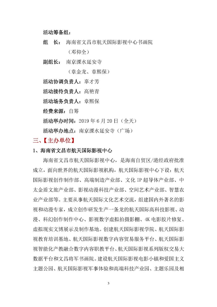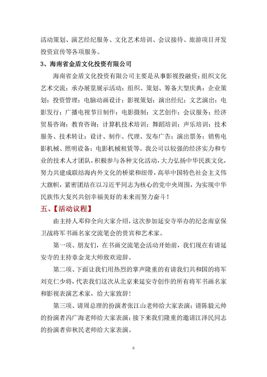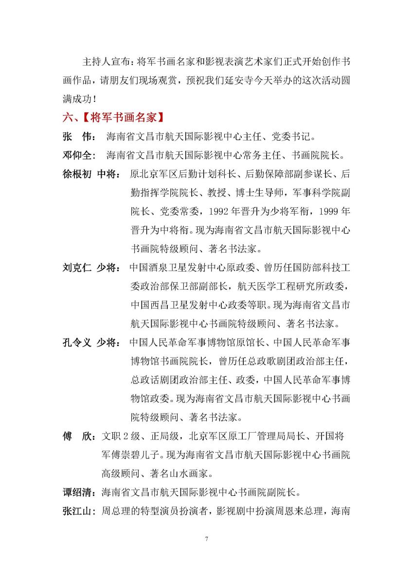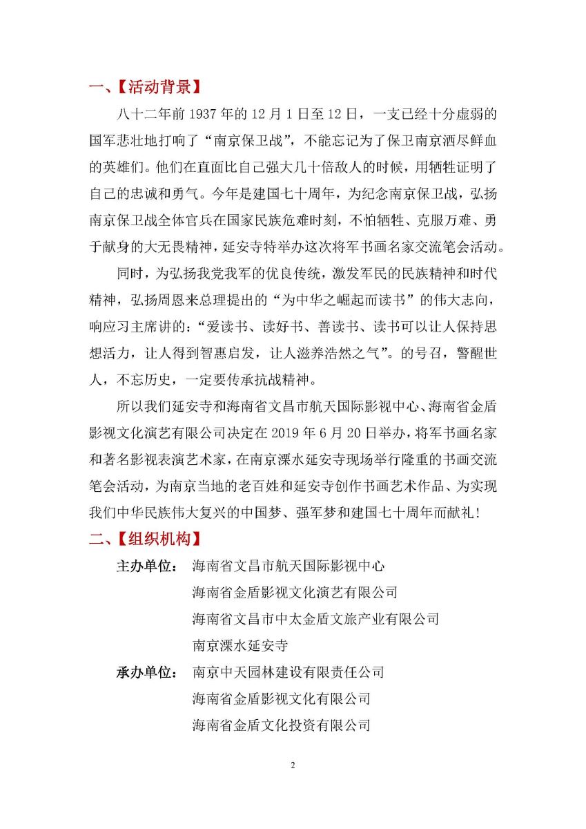 海南省文昌市航天国际影视中心、海南省金盾影视文化演艺有限公司携手延安寺决定在2019年6月20日举办,将军书画名家和著名影视表演艺术家。为纪念南京保卫战,弘扬南京保卫战全体官兵在国家民族危难时刻,不怕牺牲、克服万难、勇于献身的大无畏精神,延安寺特举办这次将军书画名家交流笔会活动。
